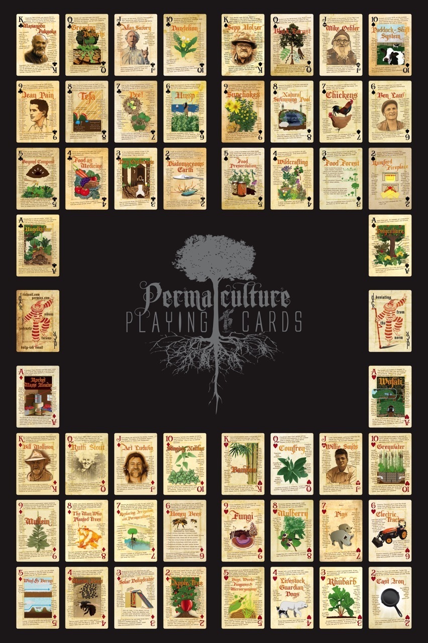 While these are fully functional poker cards, their primary purpose is to show people the rich diversity of permaculture. Permaculture embraces gardening well beyond organic, plus natural building, greening the deserts, alternative energy, feeding the world and blazing a trail for less toxic living.