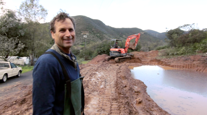 This is for the first movie in the World Domination Gardening set. The set covers two separate workshops (one in a warm climate, and the other a colder climate) and covered the earthworks for building a pond without a liner, a swale, and a hugelkultur bed on a terrace. Then we added more footage by doing the same workshop over again in a colder climate.